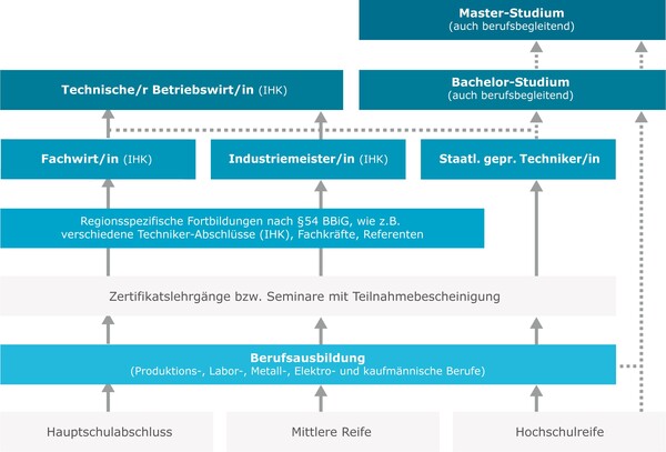 Die Industrie- und Handelskammern (IHK) bieten aufbauend auf die duale Ausbildung passende Weiterbildungen zum/zur Fachwirt*in, Techniker*in oder Meister*in an. Während der/die Fachwirt*in in der Regel das Wissen in einem speziellen Gebiet vertieft, bereitet der/die Meister*in auf Führungsaufgaben (z. B. im Produktionsbereich) vor. - Studium oder Kurse an Hochschulen
