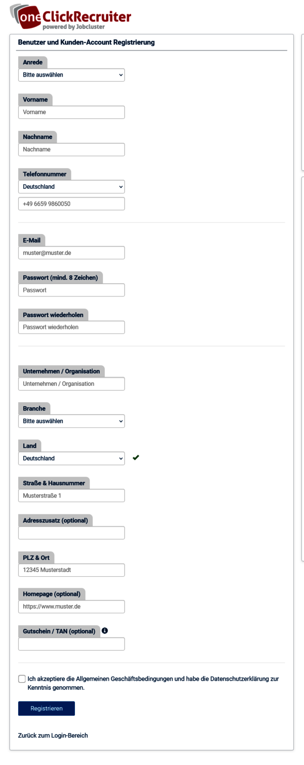 - Registrieren Sie sich im One-Click-Recruiter mit Ihrer TAN und legen Sie Ihrer individuellen Zugangsdaten (User und Passwort) fest. Bei Fragen zur Registrierung im One-Click-Recruiter nehmen Sie gerne Kontakt mit dem Service-Team von jobcluster auf. Nach der Registrierung können Sie unmittelbar mit dem Einstellen Ihrer Stellenanzeigen beginnen.