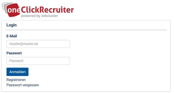Bei Ihrer Registrierung haben Sie Ihre persönliche Zugangsdaten für den One-Click-Recruiter von jobcluster festgelegt. Loggen Sie sich >> hier mit diesen Zugangsdaten ein, um Ihre Stellenanzeigen einzupflegen und zu verwalten.